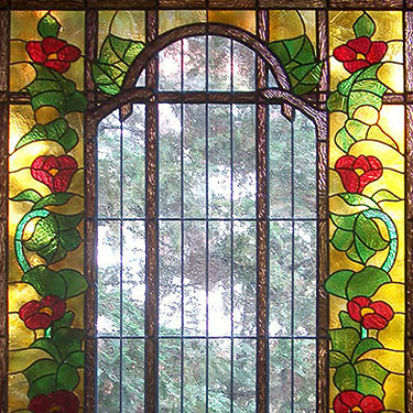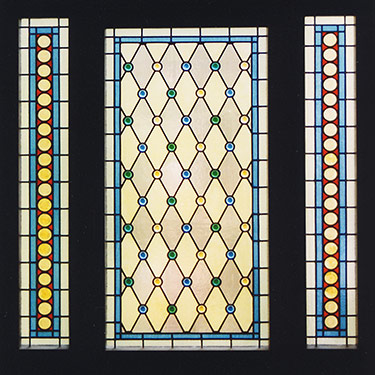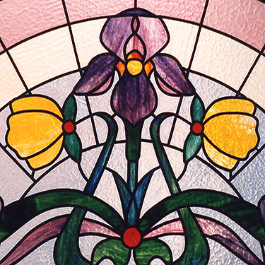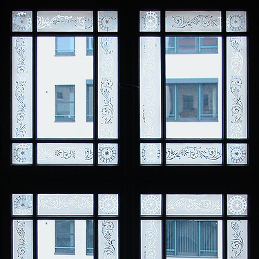 Neuherstellung von Bleiverglasungen nach Entwürfen einer Leipziger Grafikern. Christianstraße 7, Leipzig.