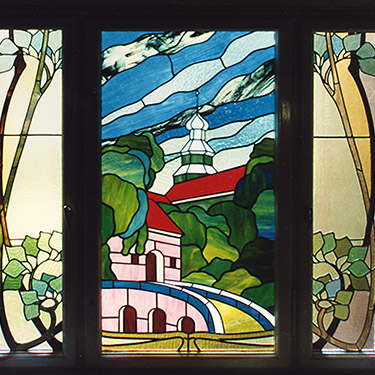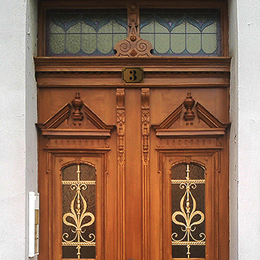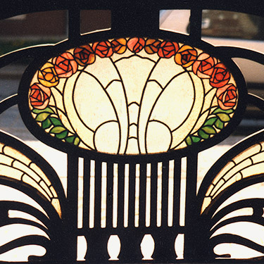 Aufarbeitung der Holzelemente und Neuverglasung. Im Oberrahmen als Bleiverglasung.