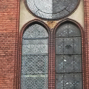 Komplette Aufarbeitung historischer Kirchen- fenster, rechts vor der Rekonstruktion, links nach dieser. Nathanaelkirche, Leipzig-Lindenau.