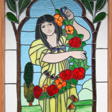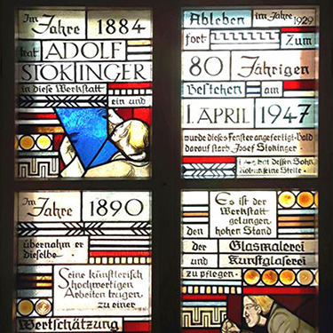 Neuerstellung des rechten Fensterflügels nach einer sehr schlechten Schwarz-Weiß-Fotografie. Das Fenster befindet sich in der ehemaligen Glasmalereiwerkstatt Stokinger, Scharnhorststraße 3, Leipzig.